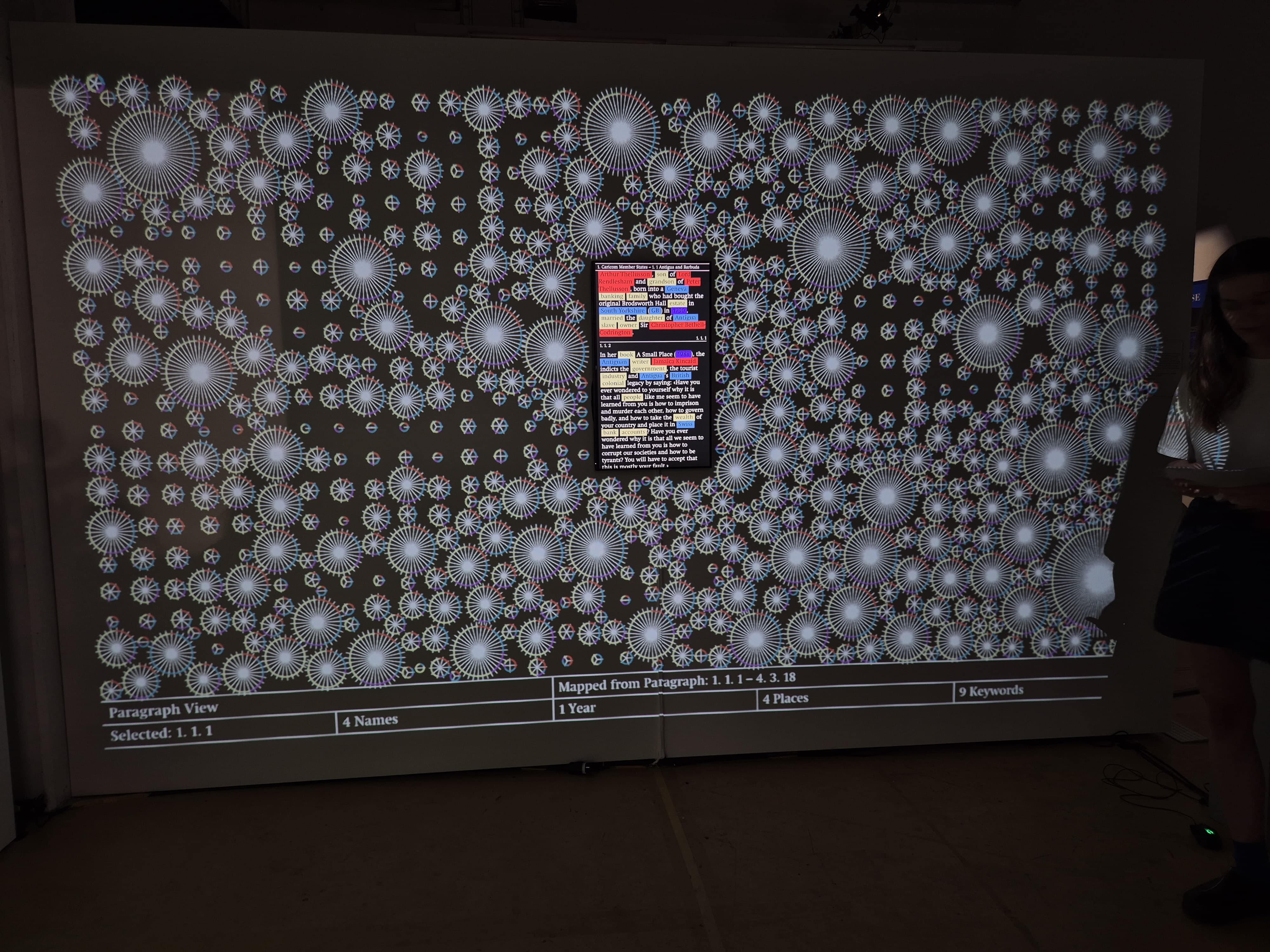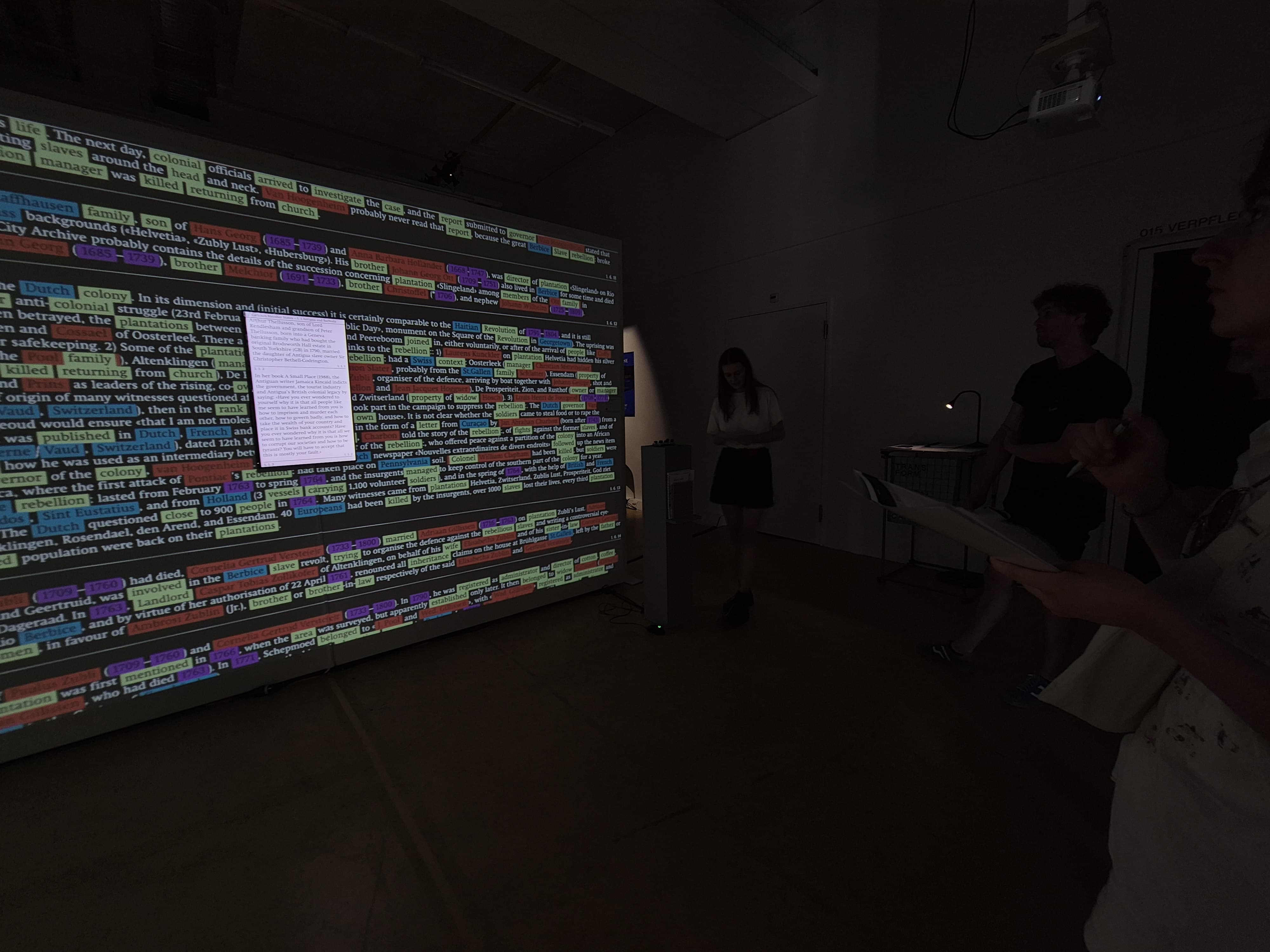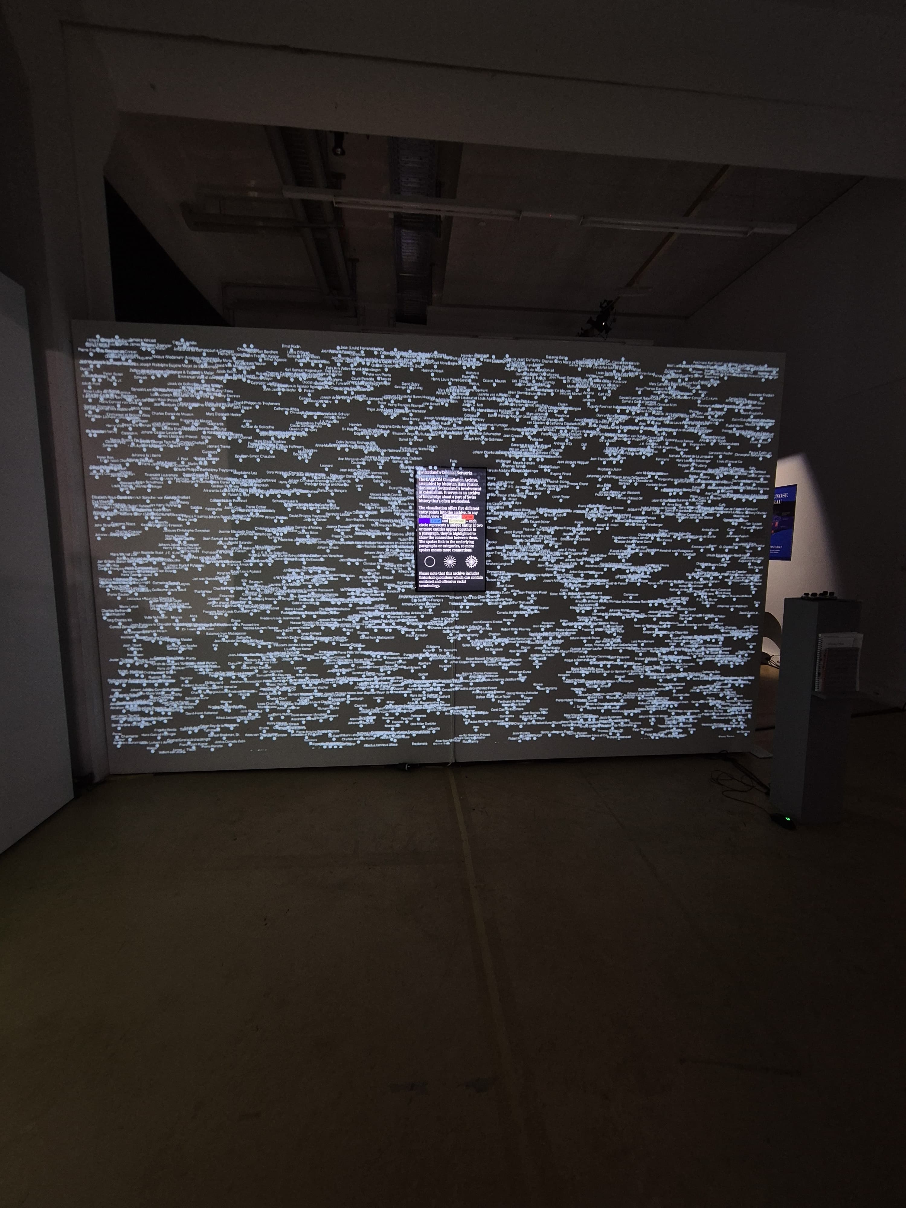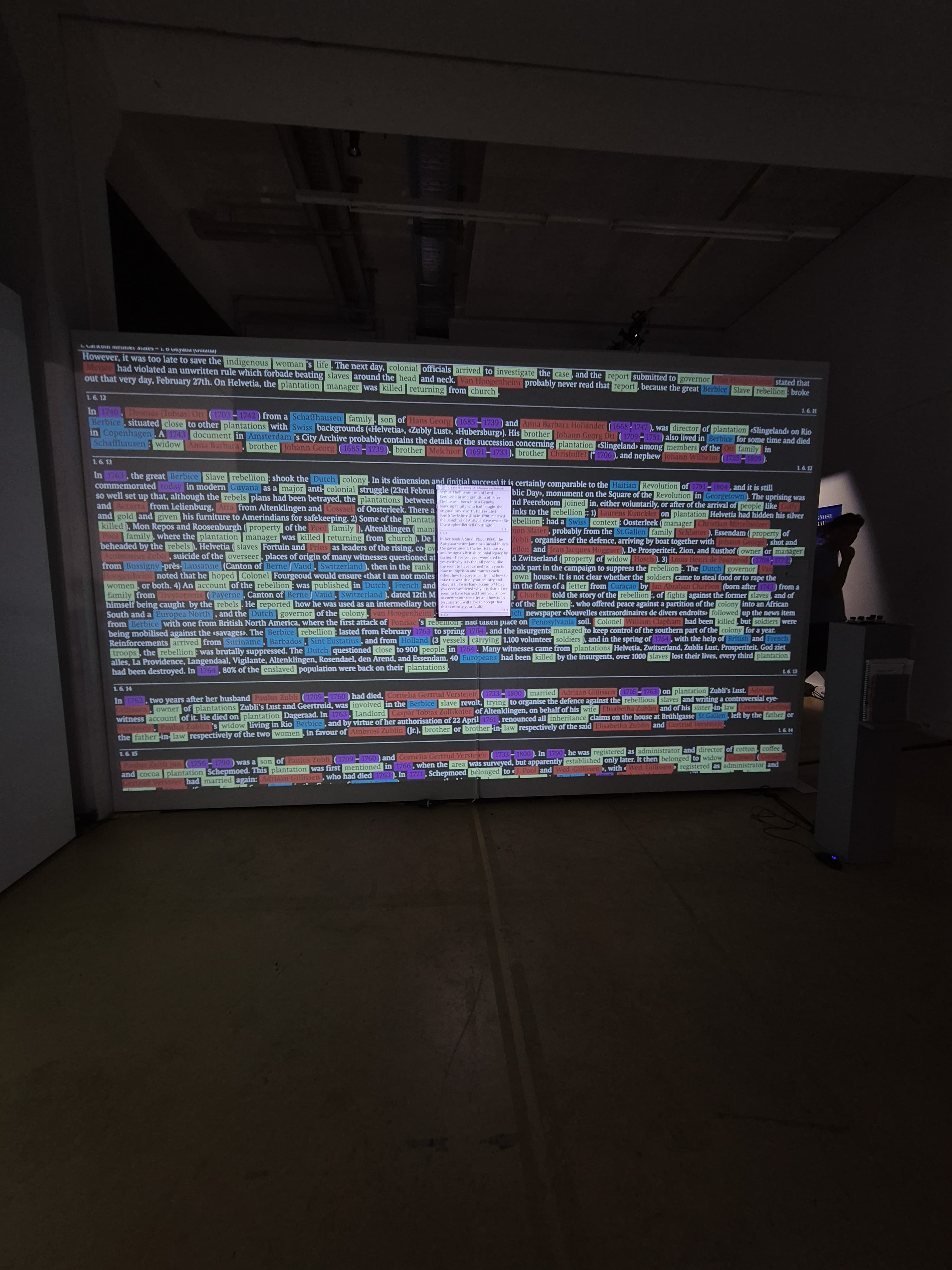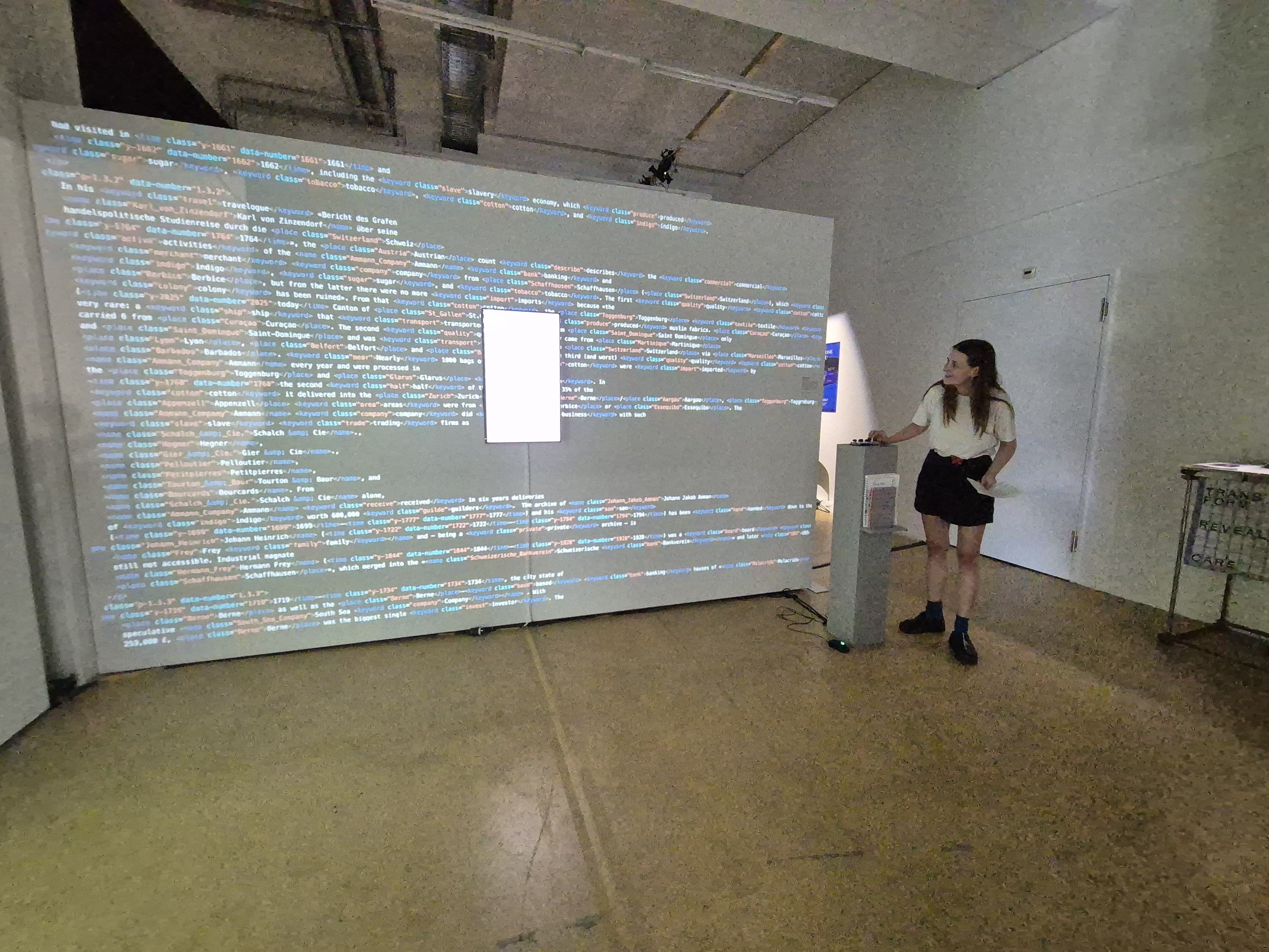 «Visual/Text» erprobt Methoden einer nicht-linearen, kreativen Praxis zur Erkundung von Textmaterialien. Im Zentrum steht das «Caricom Compilation Archive» des Historikers Hans Fässler, das mit rund 71’600 Wörtern die kolonialen Verstrickungen der Schweiz dokumentiert. Die interaktive Visualisierung öffnet einen Raum zwischen Wort und Bild, der dazu einlädt, eigene Wege durch das Material zu gehen. Dabei werden Akteur:innen, Orte und Ereignisse verknüpft – alternative Lesarten entstehen, und Netzwerke werden sichtbar.